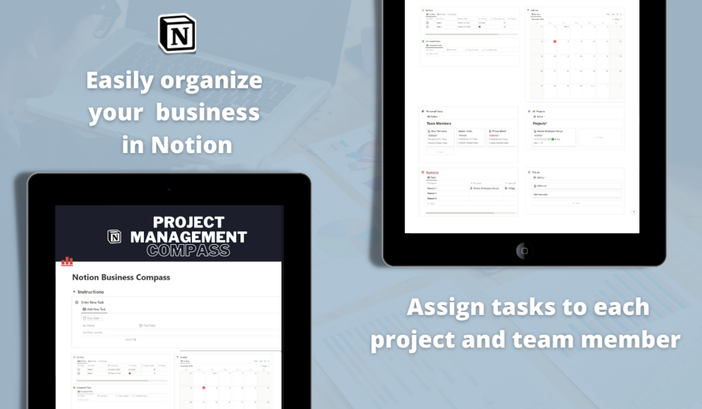 Keep your team focused and organized with the Notion Small Business Compass. Effortlessly assign tasks to team members and projects, so everyone is informed about everything important at all times. Streamline your workflow and make sure nothing falls through the cracks.