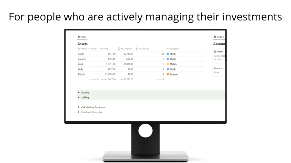 It is the only Notion template that is allowing you to manage 4 different asset classes (stocks, cryptos, currencies, metals) + an unlimited number of accounts within of just one simple dashboard.