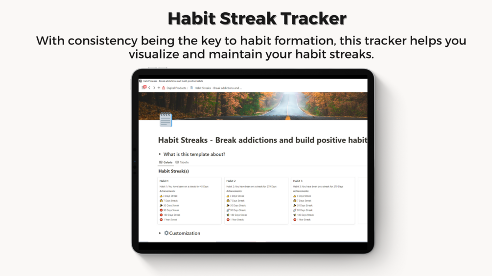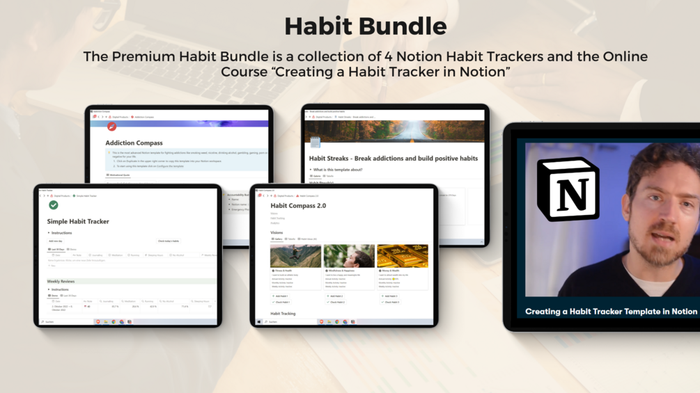 The Premium Habit Bundle is a collection of four exclusive Notion Habit Trackers + my online course "Creating a Habit-Tracker Template with Notion".
