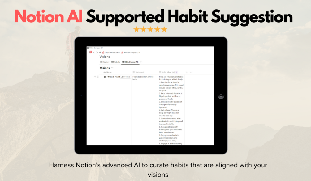 - 🎯 Notion AI-powered habit suggestions: Harness Notion's advanced AI to curate habits that don’t just sound good—they're scientifically aligned with your goals.